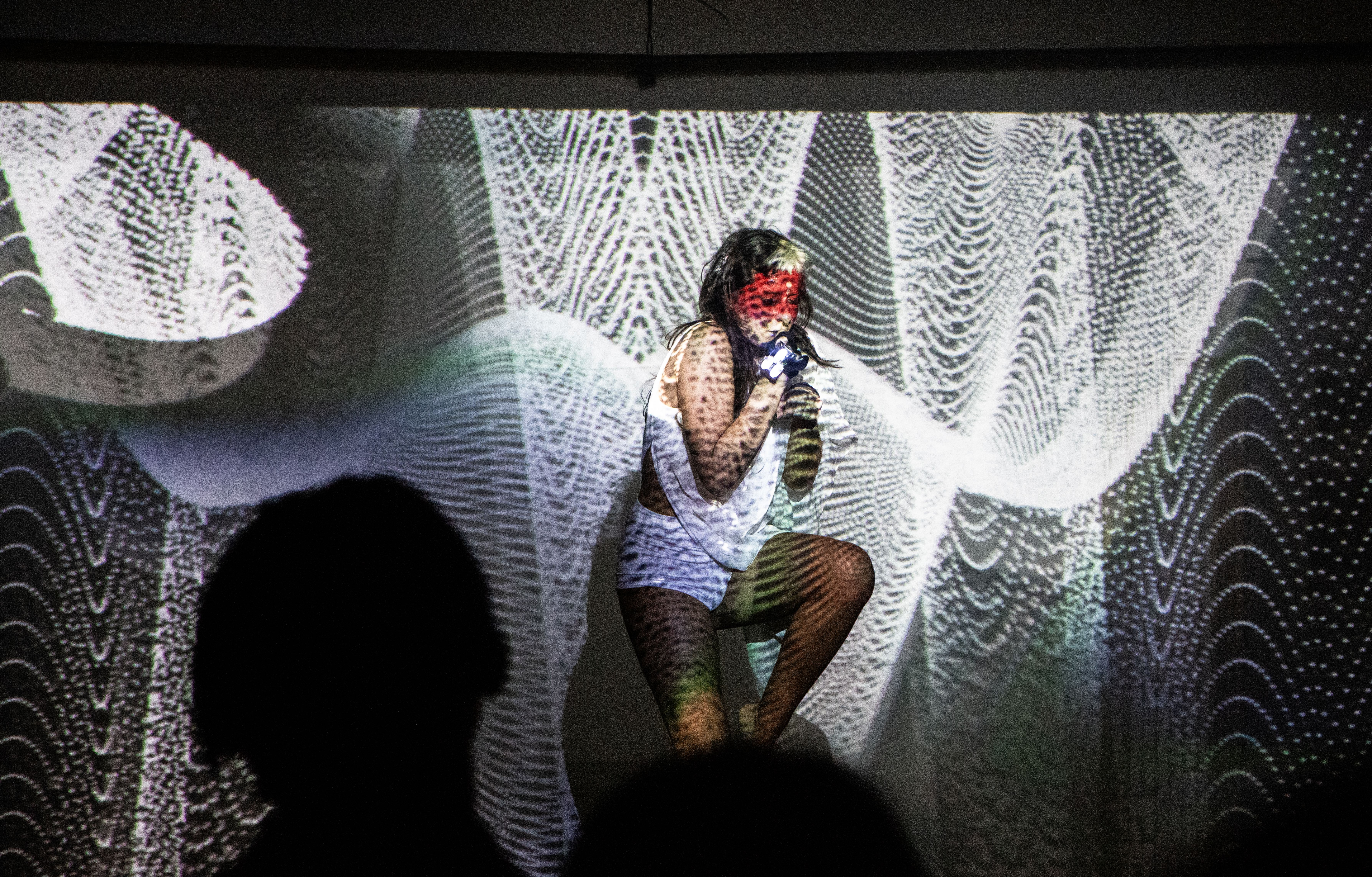 Performance, Berlin, 2024Bloomscapes is an interactive media performance exploring the journey of the self in an unknown world. Its story unfolds in four chapters, beginning with vulnerability and confusion, and ending in resilience and tranquility. Through sound and image the body traverses different emotional states. It acts and reacts to the media, while at the same time affecting the audiovisual scenery. Improvised elements, which emerge from the interconnectedness of the sonic and visual systems contrast with the choreography and create moments of tension and release. Through the feedback loop between each performer Bloomscapes aims to break the barrier between what is in our control and what is not.